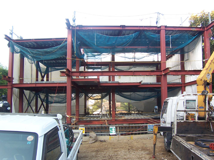 田園調布の家(7) 現場報告 2010年08月25日 しばらく振りの現場報告。現場では、着々と工事が進んでおり先日、とうとう鉄骨が組まれました。この建物は、敷地奥に地下がある為、奥のボリュームを先行して組み上げ、その後、手前のボリュームを組み上げる2段階の鉄骨建て方工事を行います。by koji