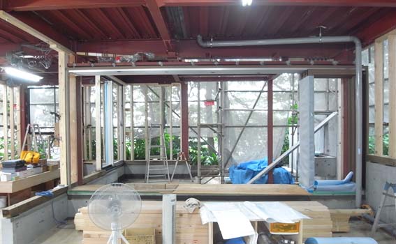 フォレストハウス(9) 現場報告 2010年08月07日 現場ではサッシが設置されたことにより、室内外の関係が、より感じ取れるようになってきました。写真は、リビングからのアングルですが、2面の森林を取り込み、想像以上に開放的な空間となってきています。by koji PR