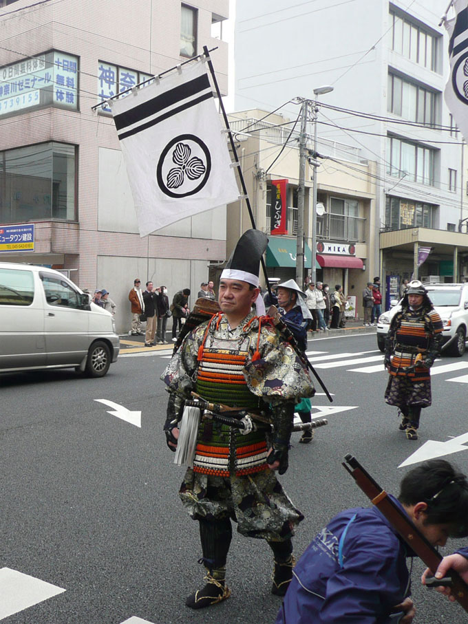 小机城址まつり ひとりごと 2010年04月07日 日曜日の朝、家をでると楽しげな太鼓の音がどこからか聞こえてきました。「何かやってるぞ」っとすこし胸を躍らせて駅前の通りに出てみると戦国時代の侍やお姫様開国当時の格好をした学生達やペリー提督小学生のマーチングバンドがパレードをしていました。『小机城址まつり』というらしく毎年春に三会寺から小机城址市民の森までパレードをやるそうです。火縄銃を撃つアクションもあり楽しく見させてもらいました。ちなみに僕の住んでいた名古屋にも似たような祭りがあります。『名古屋まつり』という祭りで、三英傑の信長、秀吉、家康を中心に戦国の武将達が名古屋の街をパレードするというものです。大きく盛大なもので、外国の方もよく見物しています。毎年、秋に開催していますからその頃に名古屋に行く方は、ぜひ見てみてください。MIZUNO