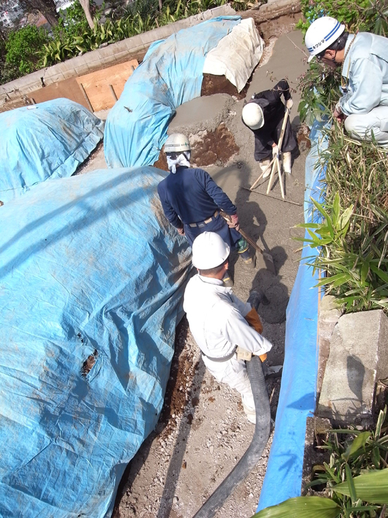 フォレストハウス(3) 現場報告 2010年04月10日 現場では、根切工事が終わり本日捨てコンクリートの打設が行われました。手際よく打ちこまれたコンクリートを平滑に整える職人さんの技には関心させられます。来週からは基礎の配筋工事に入ります。by koji