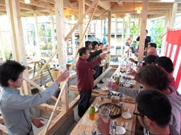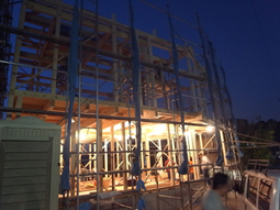 『葉山の家』上棟 現場報告 2009年11月07日 本日、『葉山の家』の上棟式が行われました。平面形状が不整形な為と前面道路の巾が狭くクレーンが使用できない為二日間にわたる作業でした。重機が使えないので一本一本手で柱や梁を組み上げていくのですが翌々日に還暦を迎える棟梁が重たい材を抱え上げる姿には感動すらいたしました。棟梁とお施主様の誕生日が同じことが判明しご両人の誕生日の前祝を兼ねた笑いの絶えない楽しい式でした。終盤にはご近所の方々がお祝いを持って来てくださり和やかな雰囲気の中現場を後にしました。これからまだ先は長いですがご満足いただけるものをお渡しできるよう決意を新たにした日でもありました。matsu