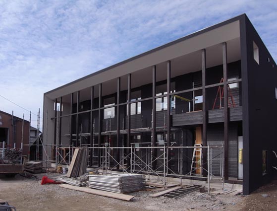 豊田の家(15) 現場報告 2009年11月23日 とうとう足場が外れ、全貌を現しました。ひときわ目を引くシャープなそのたたずまいに感無量といった感じです。今後は、正面に木製ルーバーを設置します。早くルーバーのついた状態が見てみたいものです。by koji PR
