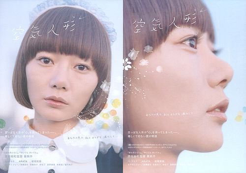 暫定一位 ひとりごと 2009年10月23日 ワタシハ ウソヲ ツキマシタココロヲモッタノデ ウソヲ ツキマシタ『誰も知らない』や『ワンダフルライフ』でおなじみの是枝裕和 監督の最新作。空気人形、いわゆるラブドールが心を持ってしまうというお話。心を持ってしまった人形と心を失った人間。一体どっちが幸せなんだろうか。最後の展開が急すぎて着地点がいまいち理解できなかったけどそれを差し引いても今のところ今年見た映画の中で暫定一位です。この空気人形の役をこなせる俳優が日本人の中にいるかと考えてみたけれどまったく思いつかなかった。たぶんいないのではないだろうか。邦画界は、特に演技に関しては韓国に大きく水をあけられているようです。 『空気人形』matsu