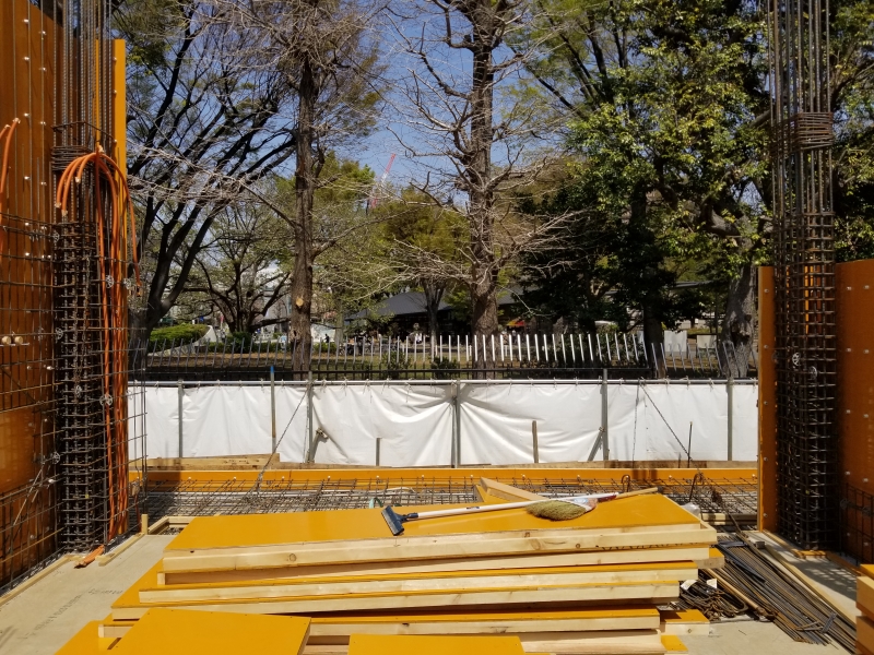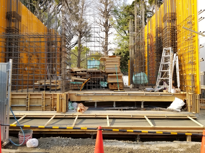 駒沢の家(3) 現場報告 2019年04月17日 駒沢の家は順調に進捗しています。1階床のコンクリートが打設され、1階壁の配筋が立ちあがっている状態です。間もなくこの1階壁にもコンクリートが打設されます。 壁が立ち上がってきたことにより建屋と隣地、借景との関係がより分かりやすくなってきました。RC造ではおおよそ1か月で1層ずつ立ち上がっていきます。徐々に高くなっていく各階床面に立つ日が楽しみです◎mogi