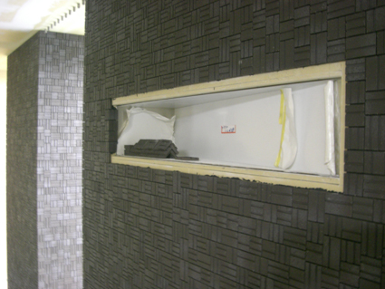 現場報告 現場報告 2009年08月17日 お盆休み中市ヶ谷オフィスの工事が着々と進んでいました。写真は社名ロゴが取り付くボックスです。ボックスが綺麗に納まるようにタイルの割付を決めています。matsu