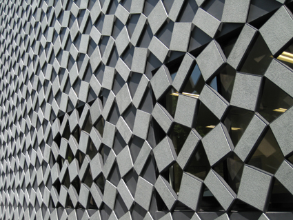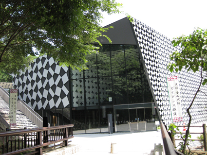 太田市金山地域交流センター 建物探訪 2009年08月20日 お盆休み終了です。お盆に実家の近くに最近完成した、気になる建物を見学してきました。群馬県の太田市にあります。隈研吾氏の設計です。正方形と長方形で組み合わされたパターンをを規則的に並べています。それが、外壁を覆い、そして、室内の天井、壁へ連続しています。この外壁のような、手法は隈氏の建築の特徴に思います。ただ、この他とは異なり、作品は、構成されている要素に角度がついています。外、室内、ともに台形が形作られています。それは小紋文様にみえ、どこか、かわいらしく、なんとなく、和的な雰囲気も醸し出しています。他にもサッシや、内装デザインにあわせた机や椅子が特徴的です。外壁の表層デザインが開口部の上を覆っている部分のおさまりが気になりました。あくまで、コンセプトを貫くといった感じです。山あいにこじんまりと立っています。近くに寄られるかたはぜひ。shimada