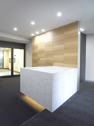 現場報告 現場報告 2009年08月24日 市ヶ谷オフィスが完成間近です。この土日に造作家具である受付台が完成しました。来社されたお客様をお迎えするこの受付台。かなりインパクト大です。タイルや突板の壁とのコントラストも綺麗です。matsu