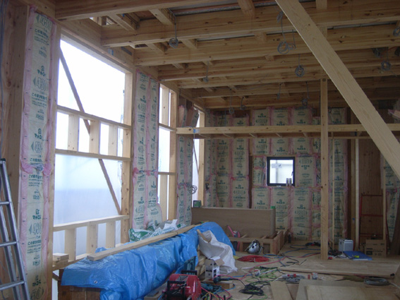 豊田の家(6) 現場報告 2009年07月30日 現場では工事が着々と進んでいます。写真は、壁に断熱材を貼りこんだ状態です。隙間無くみっしりと入れる事で、より断熱効果が高まります。壁の中に隠れてしまい普段は目にしませんが、快適に生活する為には、重要な部分です。by koji