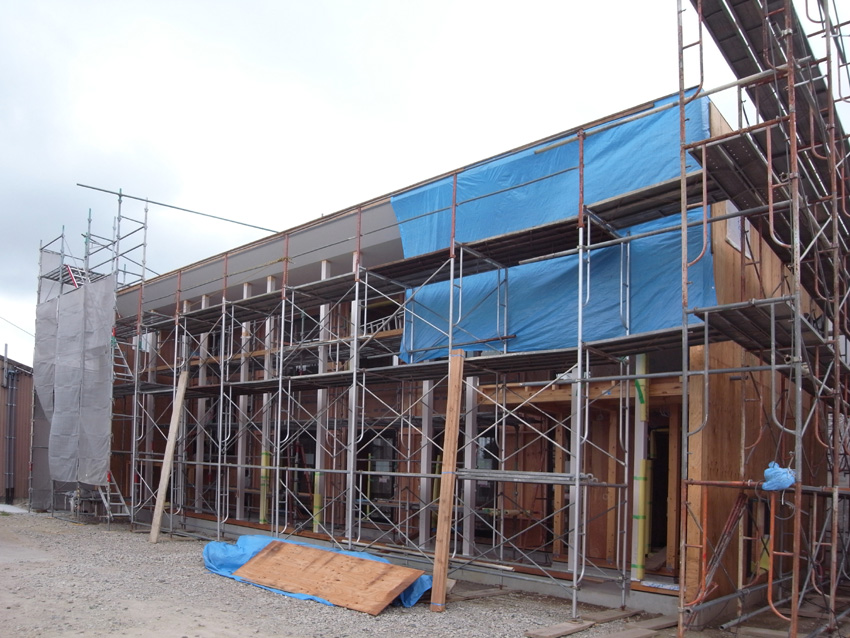 豊田の家(7) 現場報告 2009年08月08日 外壁の合板、軒天のボードが貼り終わりました。屋根の軒先は先端を細くして、建物のフォルムをよりシャープに見せています。今後は、内部の造作工事が進みます。by koji PR