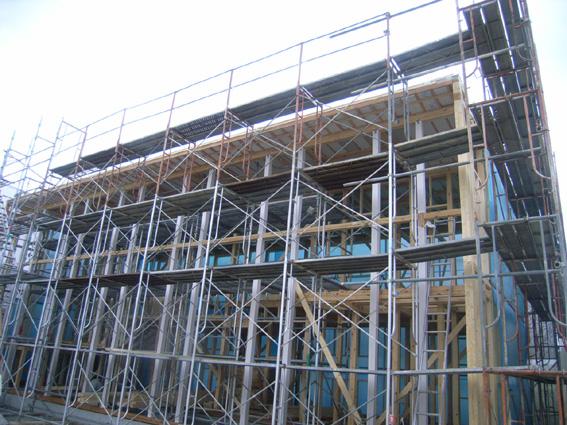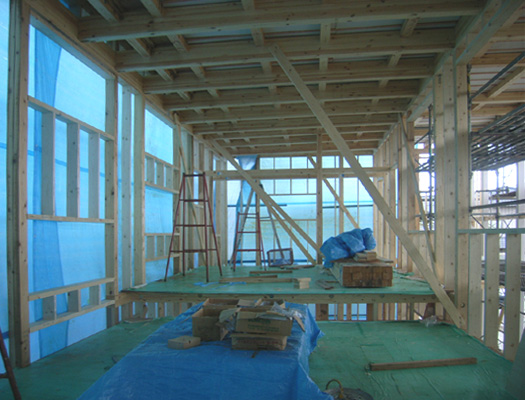 豊田の家(5) 現場報告 2009年07月14日 前回の現場報告では、まだ基礎工事が終わったところでしたが、その後、無事上棟し、屋根工事が着々と進んでいます。建物の骨格が出来たことで、内外共にスケールが感じられます。今後は外壁の合板貼り、サッシ取付と工事が進みます。by koji