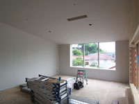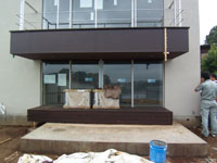 王禅寺の家(14) 現場報告 2009年07月02日 外構工事が始まりました。サッシの前にウッドデッキが貼られました。樹種はウリンです。デッキ面は室内の床や窓カウンターと連続しているので、その色に合わせて保護塗料を塗っています。写真でデッキの手前にある土間コン部分にはこれからタイルが貼られます。内部は木製建具が設置されて、壁・天井のクロスを貼っている途中です。クロスは外壁の色に合わせて若干グレーがかった色のものを使用しています。来週は植栽工事が行われる予定です。by tamura