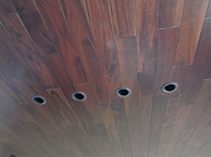 王禅寺の家(10) 現場報告 2009年05月23日 現場はそろそろ内装やタイル、家具建具の工事等にとりかかるような状況です。写真は1階の天井で、床で使用しているフローリングと同じものを張っています。(丸穴はダウンライトです。)重厚感があってなかなか良いです。普通は下を向きながら床に張るものを、上を向きながら天井に張るので大工さんはとても大変だったようです。ご苦労様でした。by tamura