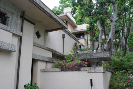 ヨドコウ迎賓館 建物探訪 2009年05月28日 先週のお寺に引き続きもう一件紹介します。「ヨドコウ迎賓館」場所は兵庫県の芦屋にあります。日本で見学できるフランク・ロイド・ライトの住宅はここだけではないでしょうか。全体的なライトの水平方向を強調したデザイン、そしてコテコテのあらゆる場所に散りばめられた細かなライト風装飾。正に、ライトの建築です。高級住宅街の高台にあります。外も、室内も落ち着きます。大阪湾を眺める演出はとても贅沢です。実はここの一番の魅力は、ライト風の和室のデザインです。言葉ではなかなか説明できませんが・・・(撮影も禁止でした)。なかなか、納得のデザインです!数あるライトを特集している本でも、このデザインは載っていないと思います。興味のあるかはぜひ。見学者も少なく、とても落ち着く場所でありました。リビングのソファーにくつろぎながら・・・外を眺め、ライトのデザインを堪能。至福のひとときです。ここもおすすめです。shimada