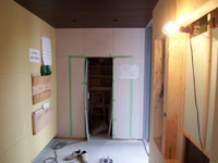 王禅寺の家(11) 現場報告 2009年05月30日 部分的にですが仕上げの工事が始まりました。写真の正面は玄関脇にある納戸の入口です。できるだけシンプルな扉にしたかったので、入口の開き扉は周囲の壁と同じ仕上げにして、かつ、枠無しで壁とフラットにしています。ついでにプッシュで開く仕様としているのでレバーハンドルやツマミが付きません。出来上がると、一見扉には見えないような仕上がりになる予定です。by tamura