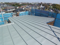 王禅寺の家(7) 現場報告 2009年03月31日 屋根板金が葺き終わり、サッシ取付と内部木下地が進行中です。昨日は屋根の上に登って板金の状態を確認しました。敷地が高台にあり、屋根勾配もそれほど大きくはないので、上に登らない限りこの屋根面を目にすることはありませんが、外壁色に近い色ということでシルバー色にしています。葺き方は瓦棒葺きです。2階フロアから見る景色もいいですが、屋根の上からの景色はさらにいいです。by tamura