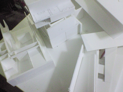 模型のスタディ ひとりごと 2009年04月04日 ただいま田園調布の家の企画設計が詰めの段階です。急ピッチで進められています。図面を描いては、模型にする作業の連続です。または、模型を作っては図面化します。二次元の図面のみでの検討し、見えていなかったことが、模型にするとまったく別の視点でみえます。その空間にいるひとにはどのようなシーンが展開するのか。1.5mの視線です。模型にするとよく見えます。建物は結局、三次元での勝負です。そこでどう見えるのか。そのため、会議室、模型室、自分の机の上は数十に、およぶ模型の山。いいものが出来つつあります。shimda