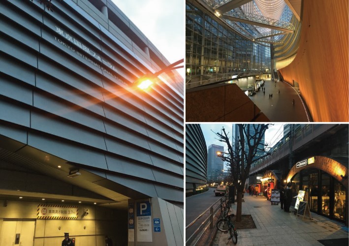 東京国際フォーラム 建物探訪 2019年03月22日 東京方面へ向かう電車の窓からいつも不思議に思っていた建築をついに地上レベルから確認することができました。地上レベルから見ることで、鎧張りのような外観が江戸城の石垣をモチーフにしているではないかと推測できたのと、フランク・ゲーリーかとも思う大空間の内部も見ることができました。印象的だったのが、横を走る電車の高架下に飲食店が連ねており、高架下の使われ方として、最高の成功例だと感じました。 yamamoto