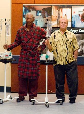 六ヶ月間で一生分笑う。 ひとりごと 2008年05月19日 いくつもの病院を経営する大富豪のエドワード。自動車修理工として油まみれになって働くカーター。そんな二人が入院先の病院で同室となりともに余命半年と宣告される。二人は「やりたいことリスト」を手に旅に出る。『見ず知らずの人に親切にする』『荘厳な景色を見る』『スカイダイビングをする』『刺青をする』『泣くほど笑う』『世界一の美女とキスをする』これらを一つ一つ実行していくんだけど旅は意外な形で終焉を迎える。リストは完遂できたのか。これまで過ごして来た人生よりも最後の半年のほうが活き活きとしている。そんな人生も悪くない。『最高の人生の見つけ方』matsu