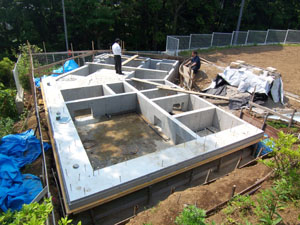 <茅ヶ崎の家>基礎工事 現場報告 2008年05月30日 地鎮祭以来、何も報告していませんでしたが、<茅ヶ崎の家>の基礎工事がほぼ完了です。HPの模型写真だとあまりわからないかもしれませんが、建物は平面が「く」の字型に折れたかたちをしています。ちなみに下の写真は、今日のは天気がいまいちだったので、天気がよかった先週に撮った写真をのせました。敷地の周りは自然が多いので天気がいい日に現場に行くと気持ちがいいです。現場に行く日を「毎週何曜日」ではなく、「天気のいい日」にしたいくらいです。by tamura
