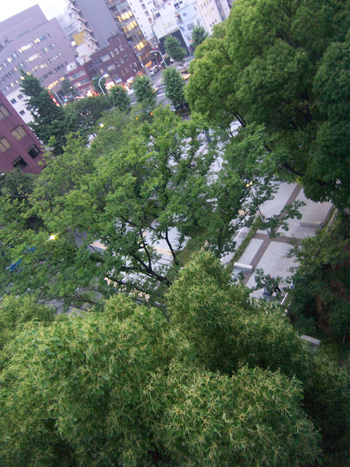 PROJECT HM 現場報告 2007年07月17日 PROJECT HM (八丁堀に建設中の集合住宅。地下2F地上14F)大きな台風が過ぎていきましたね。施工中の現場だけに、問題が起きていないか不安に思っていました。現場監督さんから無事との連絡を受け、一安心。と同時に、雨の中作業をされている職人さん・現場管理の方々に頭が下がる思いと感謝。現場は順調に躯体工事が進んでいます。現在、6階躯体施工中。6階からの眺望。眼下に南側公園の緑が広がっています。by maru