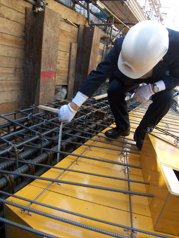 PROJECT HM 現場報告 2007年04月09日 PROJECT HM(地下2階・地上14階、八丁堀に建設中の集合住宅)地下から着々と工事が進んでいます。先週末に、地下1階床の配筋検査に行って来ました。コンクリートを流し込む前に、鉄筋間の距離や、必要とされるかぶり厚さなどを検査しました。各工程では、施工会社の自主検査と、工事監理者(意匠設計者と構造設計者)による検査を行っています。by maru