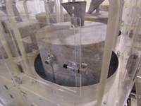 石臼 現場報告 2007年02月23日 昨日、H社そば粉工場棟の現場にいってきました。建物本体は昨年に完成していて、それからはそばの実をそば粉に加工するための機械を設置する工事をしていました。写真はそば粉を挽くための「石臼機」。本物の石でできた昔ながらの石臼が機械のなかに入っています。名前に機械の「機」がつくくらいですから、何かもっと機械的にガシャンガシャンという感じでそばの実が粉になっていくものだと勝手に想像していたのですが、まさか本物の石臼で挽いているとは思ってもいませんでした。ネットで調べてみると、石は製粉時の摩擦で発熱しにくく、そば粉の油分やでんぷん質の損傷が少ないので、石臼を使うといいそば粉ができるらしいです。by tamura
