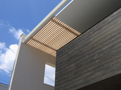 ハレ 現場報告 2006年08月20日 本日PROJECT-Oの現場にて。快晴。屋根先端の隙間から覗く青空がとてもシャープ。外観はほぼ完成形です。外構もそれに追いつけと着々と進行中。そろそろ植栽工事に入ります。今日もとても暑い日でしたが、室内には涼しい風が通り抜けていました。tamura