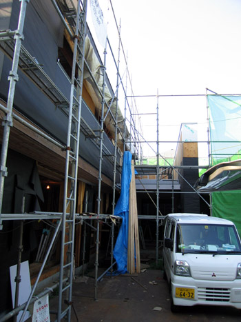 スーパーサンドイッチ 現場報告 2006年08月12日 少しずつ完成に近づいてきました。これは黒い建物・・・ではありません。実は真っ白い建物です。真っ白な塗装をする前に、防水のために黒いシートを貼っています。建築の壁とは内側から内装仕上げ材(壁紙等) ↓石膏ボード ↓べにや板 ↓ 柱 ↓断熱材(ガラス繊維の綿) ↓べにや板 ↓シート(防湿・防水など) ↓鉄の網入りモルタル(セメントのようなもの) ↓ひび割れ防止のネット ↓外装仕上げ材(セメントのようなもの)という順番で成り立ってます(この建物の場合)。まさにスーパーサンドイッチ。さあみんなも自分ちの壁をぶっ壊して見てみようぜ!by soma