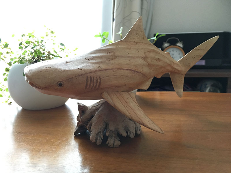 ジンベイザメ 所員の趣味 2017年08月08日 木彫りの置物を買いました。曲線の美しいジンベイザメの置物です。東急ハンズで一目見た時から、心を掴まれていたのですが、価格と大きさから衝動買いは抑えました。…抑えたものの、結局、後日お迎えにあがってしまいました。後悔はしていません。kaisei