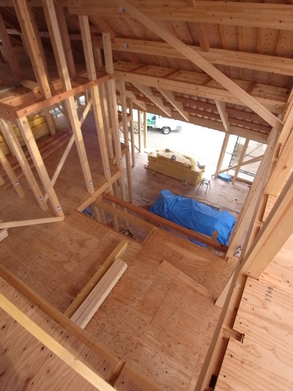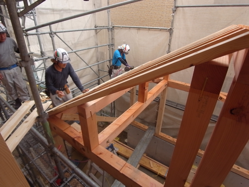 矢作の家(6) 現場報告 2016年07月05日 梅雨により予定日より少し遅れましたが矢作の家は無事、上棟を迎えることができました。 大迫力の屋根!模型では感じ得ない実物の力強さを感じます。 内部の吹抜空間も迫力があります。 大工さんの真剣な眼差しとテキパキした動きによって姿形が出来上がる様は感動的でした。今月は外装工事がメインになるので外壁・屋根・サッシが納まっていくのが楽しみです◎mogi