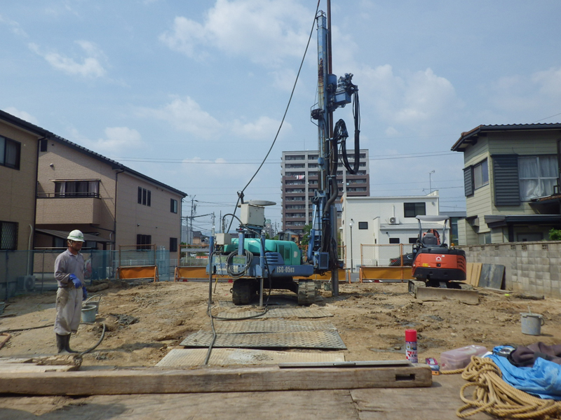 矢作の家(4) 現場報告 2016年05月20日 矢作の家では施工図での検討も終盤を迎え、いよいよ着工しました! まずは建物のまさに基礎となる杭工事・基礎工事からスタートです。横浜市での事故のようなことがあってはいけないので1本1本位置を確認し、固い地盤(支持層)まで到達するよう慎重に施工します。約1カ月後には上棟を迎えるため、建物がおおよその姿を現すのが今から楽しみです◎mogi