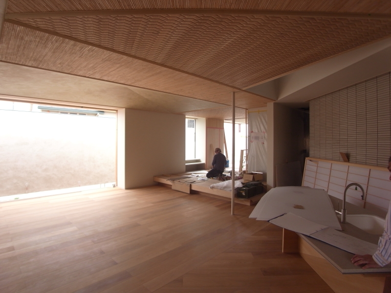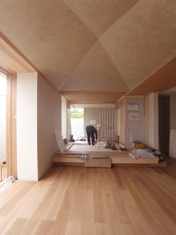 百合ヶ丘の家(15) 現場報告 2016年04月30日 内部が概ね完成してきたので、全体の清掃し、再度調整を行います。折角なので、茂木さんにキレイに撮ってもらいました(笑) 天井の葦材・フローリング・網代・塗装が美しく表現されています。家具が置かれるのが非常に楽しみです。天井の塗装が美しい陰影を出しています。折り天井の迫力がすごいです。完成がとても楽しみです。souhei