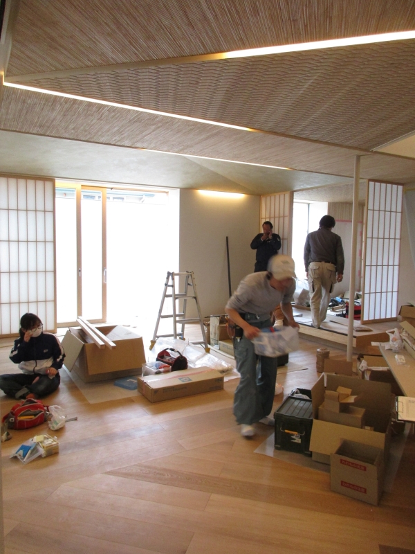 百合ヶ丘の家(16) 現場報告 2016年05月02日 4月末の連日の悪天候で、工程が一週間程度延びましたが、現場はGWも休まず動いています。現場の工程に合わせて、甲村や私も連日、工事監理を行っています。 多くの職人さん方に協力していただき、一気に工事が進んでいます。 照明の点灯チェックを行っています。完成まであと少しです。souhei