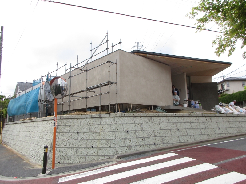 百合ヶ丘の家(14) 現場報告 2016年04月20日 足場が外れ、外観が見えてきました!外部の塗材が壁面を美しくしています。凄い浮いている感じです。 タイルを職人さんが貼っています。タイル割り付け図にそって一枚一枚貼ります。とても大変そうですが、キレイです。 外構の打ち合わせをしています。細かい段差の調整中です。 完成間近なので、気を引き締めて頑張りますsouhei