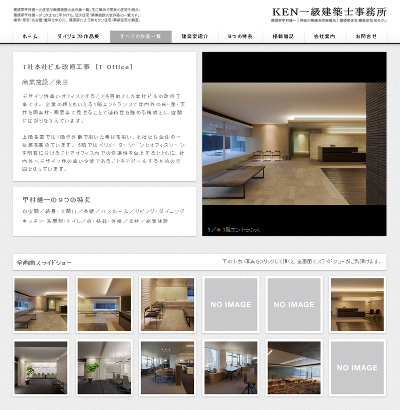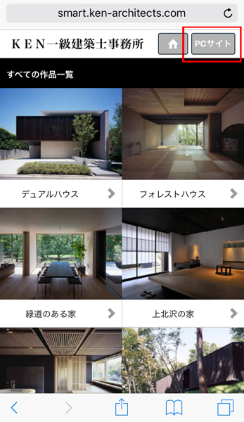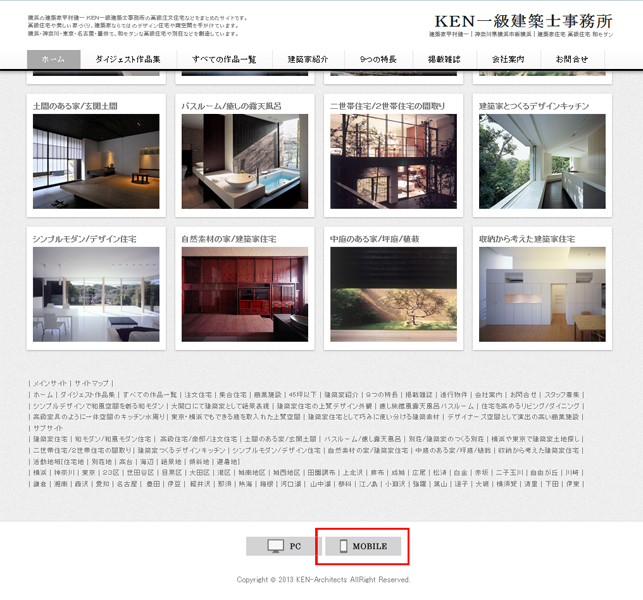 スマホサイト・HP更新のお知らせ 最新情報 2016年02月20日 スマートフォンからのアクセスが増えてきたためスマホ用のサイトを全面リニューアルしました。 今までスマホからは簡易サイトを閲覧頂いておりましたが、今回はPC用サイトとほぼ同じ内容をご覧頂けるように作成しました。また、スマホからは見られなかったPC用サイトもご覧頂けるよう調整しています。※ご使用の端末によっては不具合の出るページがあるため 不具合のあるページはスマホ用にてご覧ください。 スマホサイトではサイト上部の「PCサイト」ボタン(上写真左)PCサイトではサイト下部の「MOBILE」ボタン(上写真右)にてそれぞれのサイトを切替えて頂けます。 つづいて、ホームページ更新のお知らせです。すべての作品一覧に「T社本社ビル改修工事」を追加しました。デザイン性高いオフィスとすることを目的とした本社ビルの改修工事です。一部未撮影箇所がありますが、PCからもスマホからも、ぜひご覧ください◎mogi