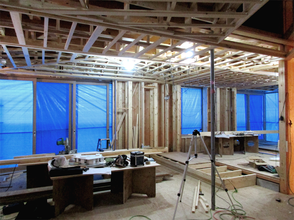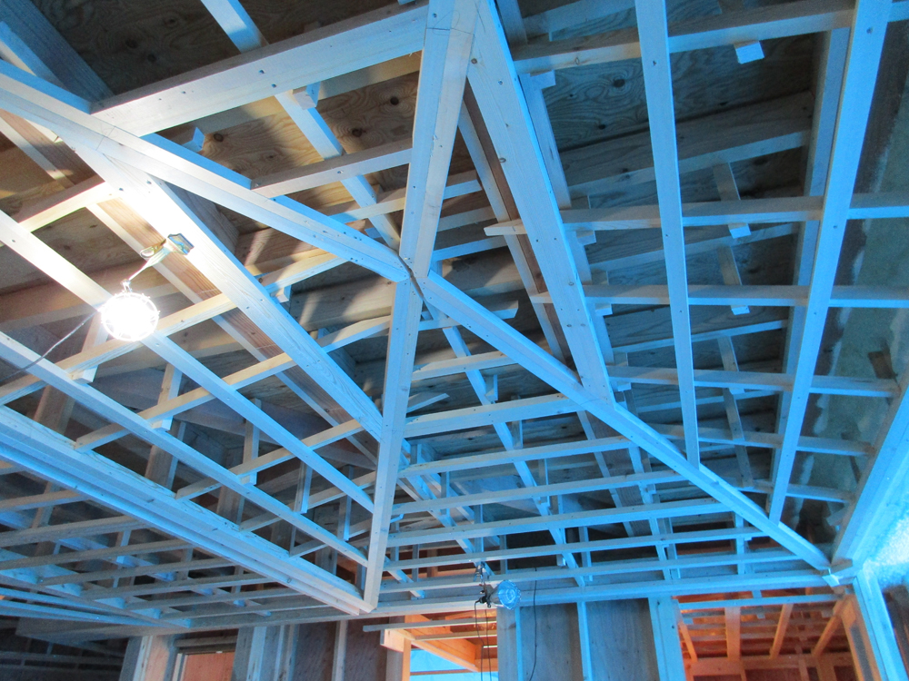 百合ヶ丘の家(7) 現場報告 2016年01月21日 前回から更新が遅くなってしまいましたが、現場は順調に進んでおります。天井の木下地が進み、おぼろげですが、内観の天井イメージが、わかるようになってきました。 折上げ天井になっている箇所は、意図通り、光の陰影がきれいに表現されそうです。 楽しみです。souhei